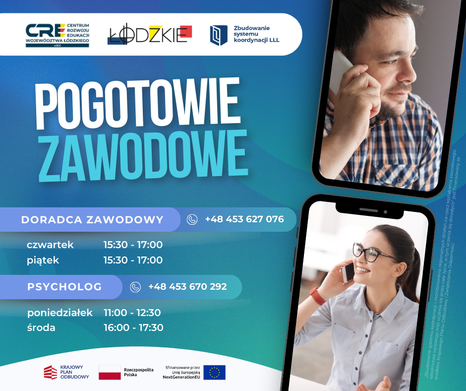 Zastanawiasz się, jaką szkołę wybrać, co studiować, albo gdzie chciałbyś pracować? Wybór zawodu i kierunku nauki to nie są łatwe sprawy. Dlatego uruchamiamy Pogotowie Zawodowe. Zadzwoń, gdy potrzebujesz wsparcia, wskazówki lub rozmowy.