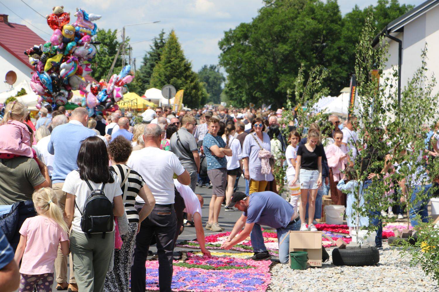 Ostatnie poprawki przed procesjąOkoło godziny 14.00 dywany były prawie gotowe. Mieszkańcy dopracowywali detale, poprawiali krawędzie i delikatnie zraszali kompozycje wodą. Kolorowe kobierce rozciągały się przez całą miejscowość, tworząc wyjątkową ścieżkę – swoistą modlitwę złożoną z kwiatów.
