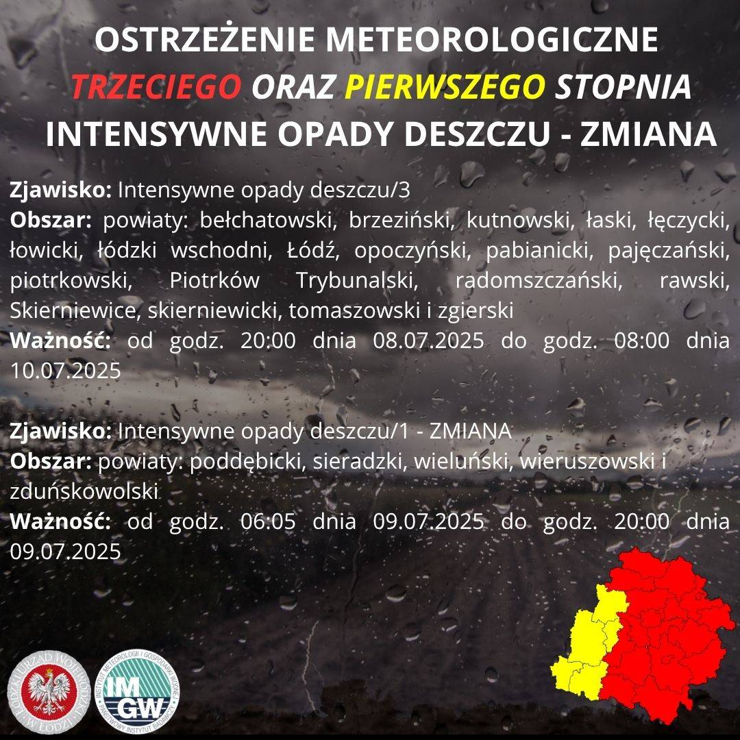 Niższym, I stopniem ostrzeżenia objęte zostały powiaty:poddębicki, sieradzki, wieluński, wieruszowski, zduńskowolski. W tym przypadku alert żółty wydano do godziny 20:00 dnia 9 lipca. W tych rejonach prognozowana suma opadów to 20–45 mm; opady umiarkowane i przelotne.